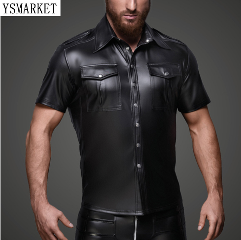 YSMARKET Mens PU Faux leather Blouse Shirts Pocket Button Detail Party Clubwear Black Top Tees Tight Sexy Latex Male Clothing