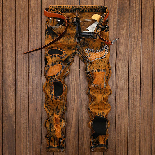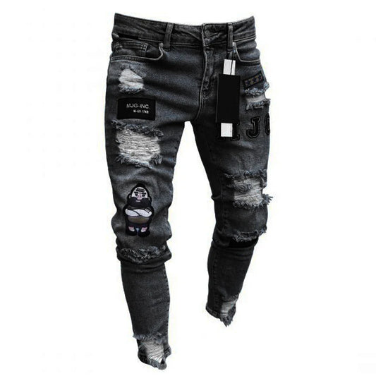 European and American men's skinny jeans embroidered ripped men denim trousers