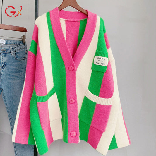 GX5588 New Streetwear Fall Winter Oversize Lady Women's V-Neck Jacket Colorful Blocking Stripe Cardigan Elegant Knit Sweater