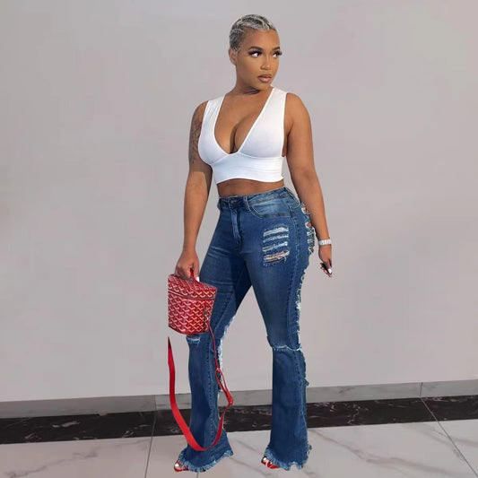 J&H 2022 new arrivals distressed jeans ladies high waist sexy ripped bell bottom jeans chic blue denim hollow out pants