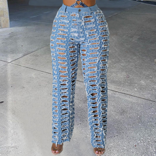 Liu Ming Fashion Streetwear 2023 Women Casual Cut Out Denim Trouser Fringe High Waist Straight Jeans Pants