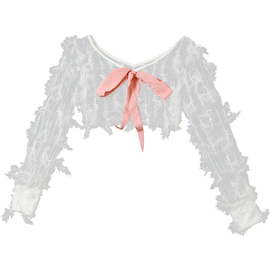 Kliou K22L16803 women long sleeve crop tops white feather see through tops vocation wear ladies fashion tops