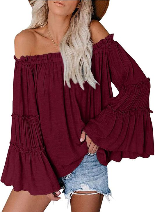 Fashion Bohemia Women's Off Shoulder Long Bell Sleeve Tops Flare Casual Plain Loose Shirts Blouse