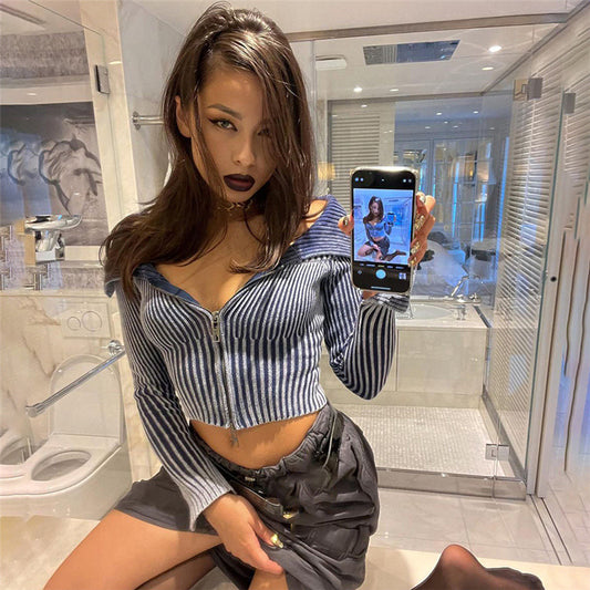 2023 Fall Winter Knit Contrast Color Sweater Women warm Fashion Lapel Slim Top Long-sleeved Crop Top Female Zipper Cardigans