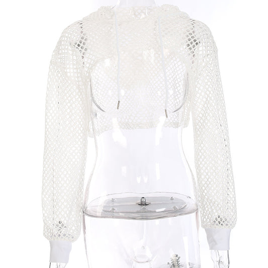 Liu Ming Women Sexy Transparent Long Sleeve Mesh Hole Cut Out Black Ladies Crop Tops
