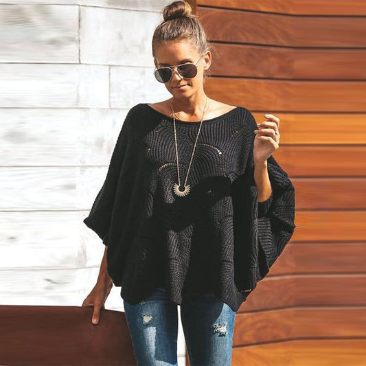 Long Sleeve Tops Wave Hem Long Batwing Sleeve Hollow Out Elegant Women Sweaters