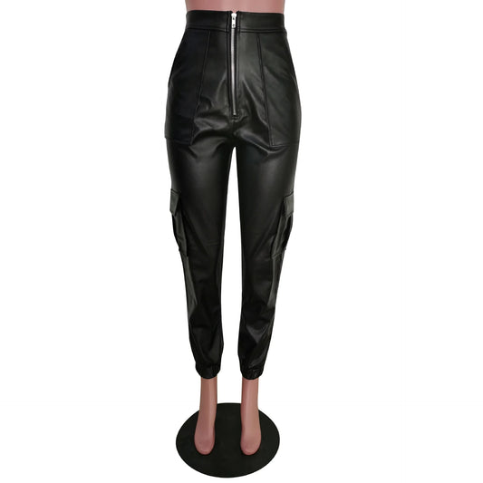 F8257 Multi Color Women Pu Leather Cargo Pants Zipper Solid Trousers Stylish Casual Pu Pants