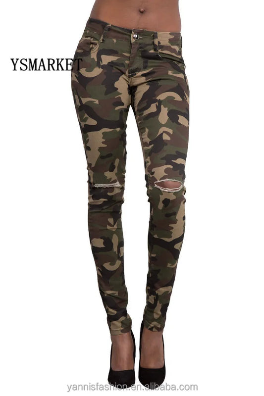 Fashion Camouflage Embroidery Pockets Pencil Jeans Women High Waist Knee Hole Denim Pencil Pants E 241
