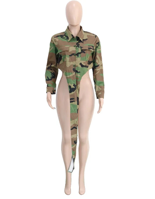 ZHEZHE 2024 New Fashion Camouflage Print Jacket Irregular Long Sleeve Crop Tops Turndown Collar Short Jacket for Women