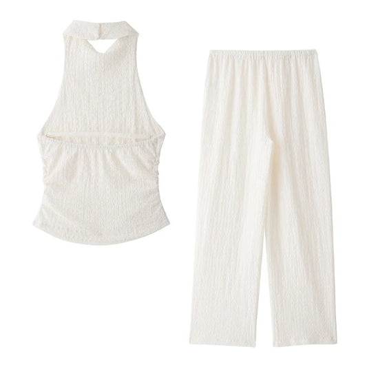 ZHEZHE Fashion 2024 Summer Clothes Boutique Lady Sexy Street Wear Women Sleeveless Halter Top and Straight Pant 2 Piece Set