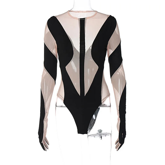 Wholesale Fashion Short Bodycon One Piece Jumpsuit See Through Mesh Long Sleeve Bodysuit Tops for Women