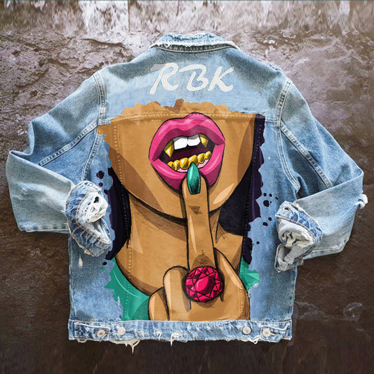 2023 hot sale fashion Finger gold teeth Character Print jeans jacket women long sleeve denim coats streetwear for fall