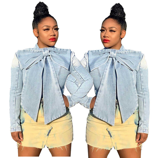 High Quality Women Fashion Bow Tie Plus Size Blouse Women Long Sleeve Jeans Top Casual Denim coats for ladies and jackets