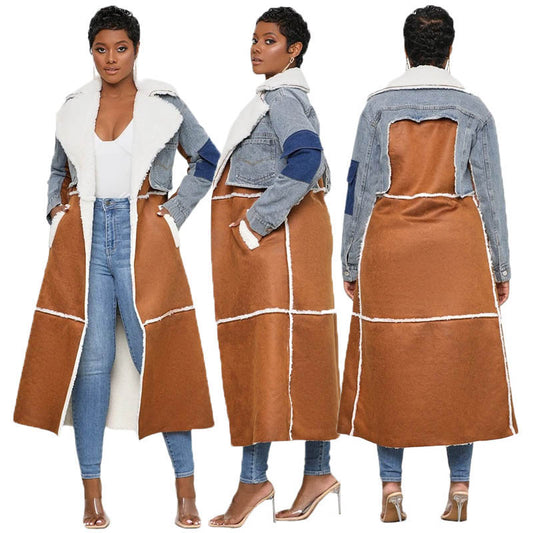 Latest jackets for women denim patchwork long coats brown for women stitching fleece long vintage jacket denim winter