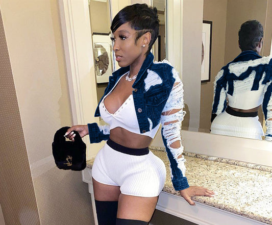 Al250 Autumn Best Selling Denim Jacket Two Piece Jean Short Set Casual Street Wear Jacket Set