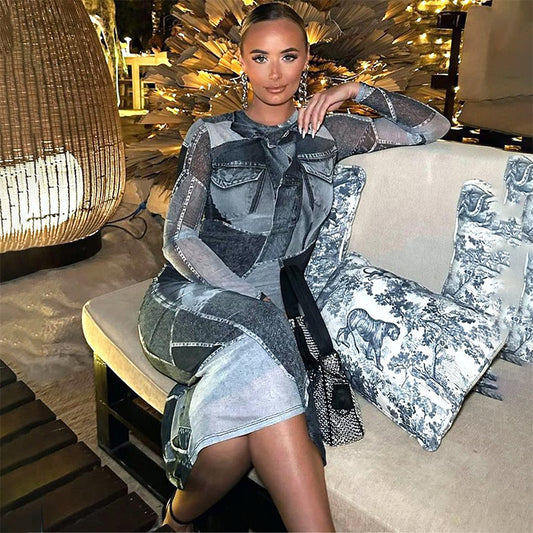 Women's Clothing 2023 Autumn New Fashion Lady Denim print Long Sleeve Maxi Dress