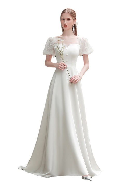 High quality Short-sleeves Simple Soft lace up Elegant Small Tail Light Luxury Satin Wedding Dress