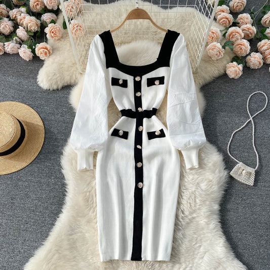 Elegant Squared Collar Solid Color Patchwork Lantern Sleeve Knit Dress Women Casual High Waist Bodycon Sweater Dresses Ladies