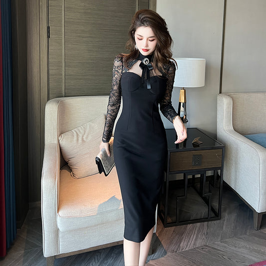ZYHT 20212 Daily Temperament French Black Dresses Party Long Lace Sleeve Dress Slim Waist Bodycon Dress