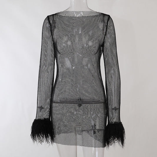 Latest Design Sexy Girls Shiny Long Sleeve Feather Patchwork Fit Mini Fall Dresses For Women Mesh See Through Dress Clubwear