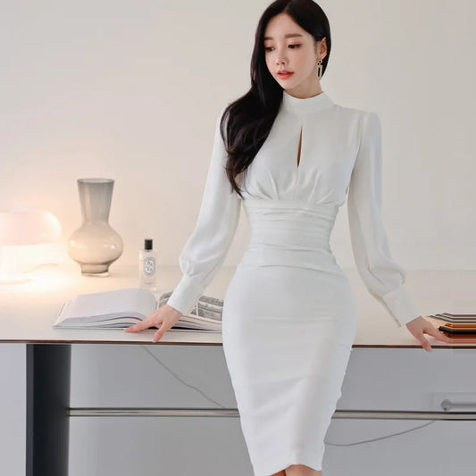 2022 Wholesale winter new Korean style ladies waist slimming lace-up hip backless white fashion long casual dress