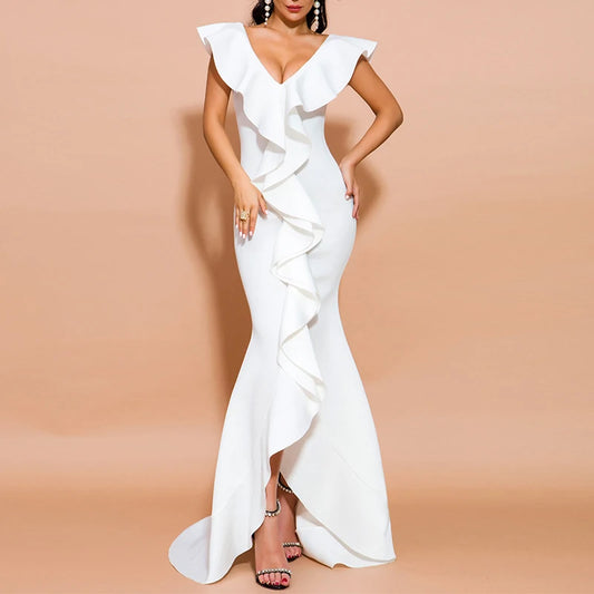 Women's Sexy Sleeveless Ruffles white Pencil V-neck Gown Evening Party Dress
