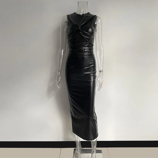 High Quality Wholesale Faux Leather Sleeveless Elegant Bodycon Midi Sexy Evening Dress