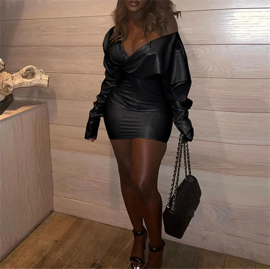 2023 Autumn Women Long Sleeve Pu Leather Bodycon Party Club Streetwear Mini Dress