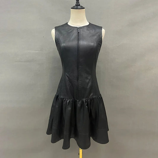 High Quality Sleeveless Black Genuine Sheepskin Leather Pleated Mini Dresses Women