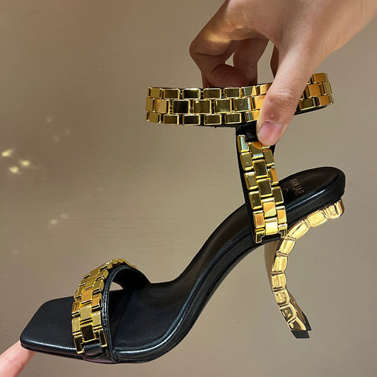 Women Sandals High Heels Metal Chain Ladies Pumps 2022 Sexy Party Wedding Shoes Square Toe Woman Sandalias Female Fashion Shoe