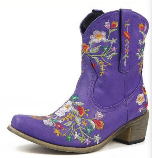 BUSY GIRL Blue Embroidery Red Pink Flower Ankle Boots Women Wide Mid-Calf Block Heels Fashion Retro Ladies Shoes Footwear