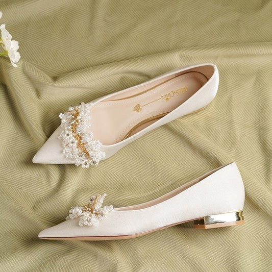 New Ladies Low Heel Wedding Shoes Bridesmaid Point Toe Pearl Shoes Luxury Girls Single Shoes