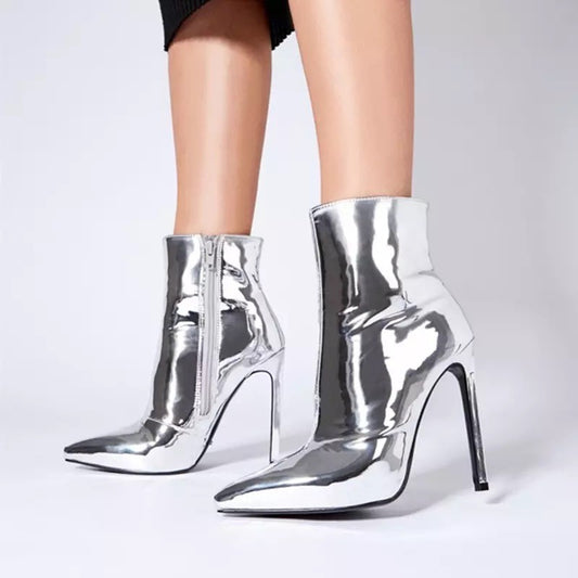 Banquet Botas Ladies Mirror Leather Boots Plus Size Pointy Toe Stiletto Heel Sexy Short Boots Women Metallic Ankle Boots 2022