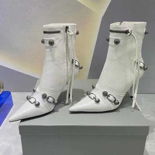 Botas De Cuero Mujer Western Cowboy Style Rivet Studded Side Ankle High Heel Gold Silver Boots for Ladies