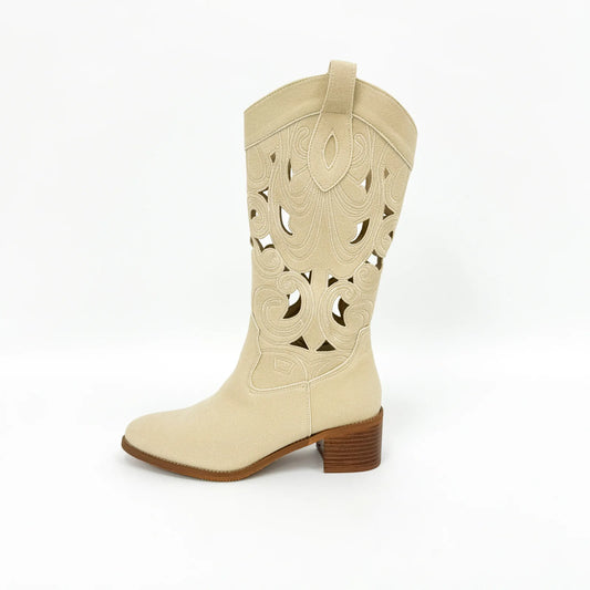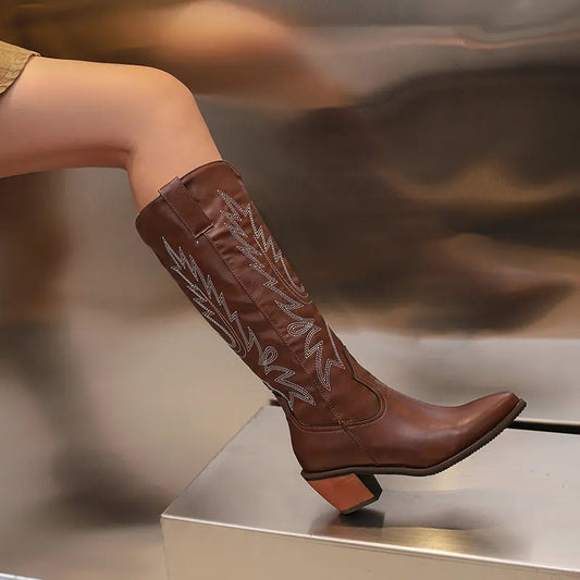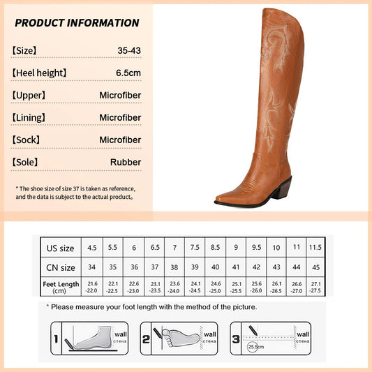 2024 Knee High Boots For Ladies Fashion Embroidery Low Heels Big Size Western Cowboy Cowgirl Boots Women
