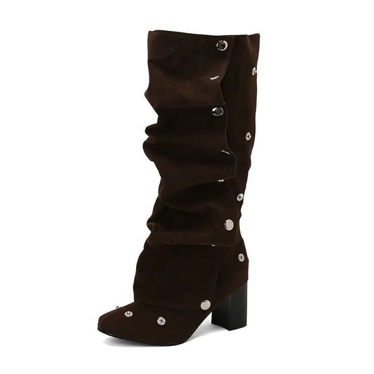 2024 Fall Winter Latest Thick Heeled Cowboy Boots for Women Blue Multi Snap-fastener Pleated Shoes Zip Wide Calf Punk Boots