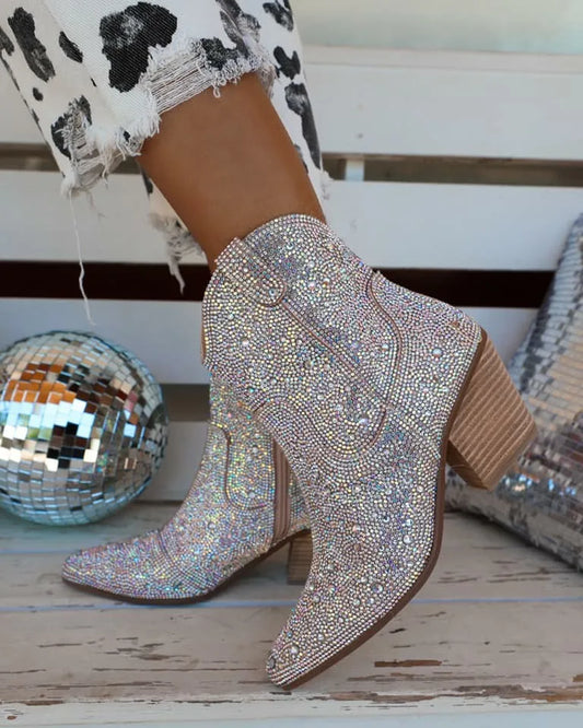 Fashion Women Ankle Boots New Spring Western Cowboy Boots Clear Glitter Bling Shiny Trend High Heels High Quality Shoes Hot