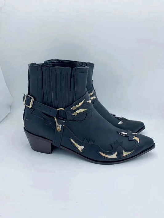 PDEP Fashion Low Heel Pointed Burnt Flower Strap Men's Knight Boots Chelsea cowboy house riding boots for men
