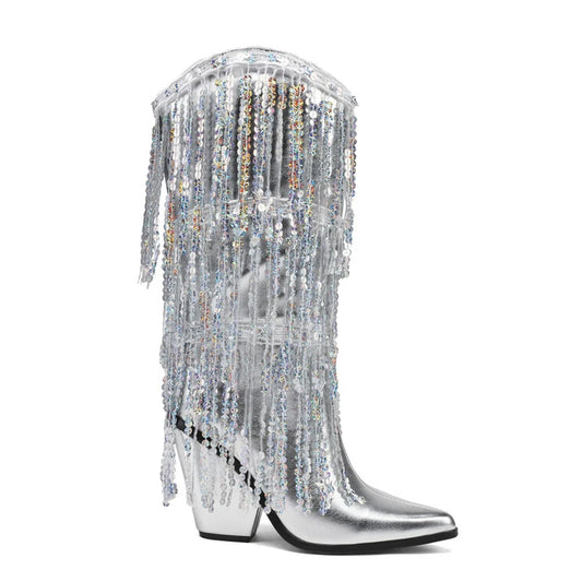 BUSY GIRL H4921 Sliver Knee High Boots Women Shoes 10cm Thick Heels Ladies Sequin Tassels Western Cowboy Boots