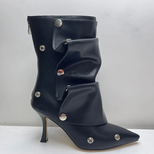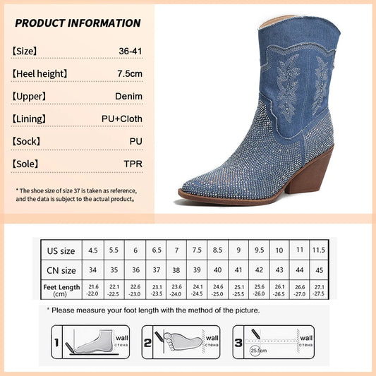 Luxury Fashion Women's New 2023 Blue Ankle Boots Denim Rhinestone Mid-calf Western Cowboy Cowgirl Boots Chunky Heels Sexy