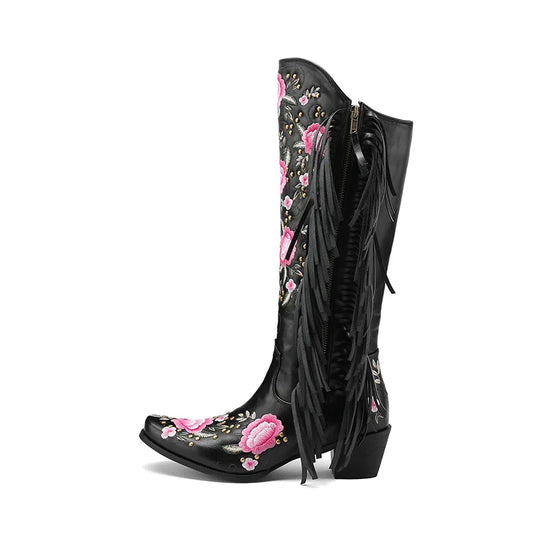 BUSY GIRL XY4845 Embroidered pink flower rivet tassel boot zip 2023 autumn winter tall knee high ladies boots women cowboy boots