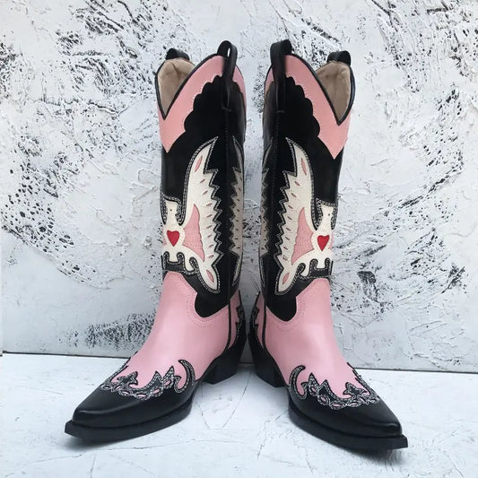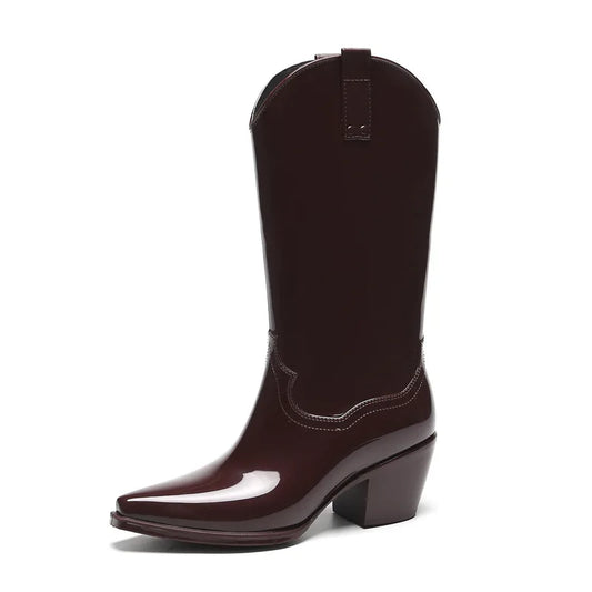 BUSY GIRL HY4944 Pink Women Rain Boots Cowboy Booties Waterproof Cowgirl Ladies Chunky Mid Heel Shoes Rubber Knee High Boots