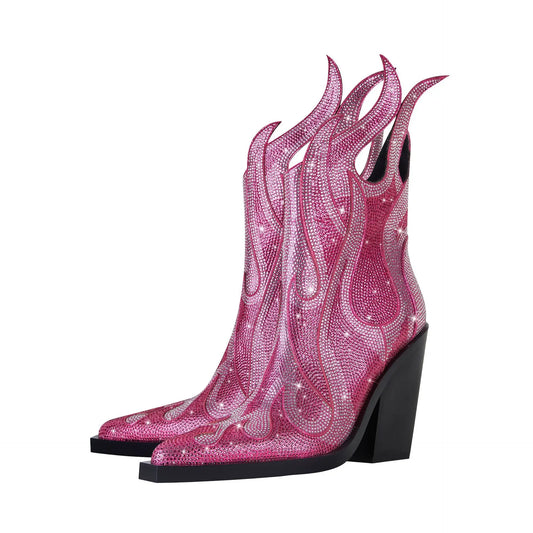 PDEP rhinestone flame square head boots women shoes thick heeled cowboy boots for women