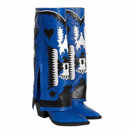 IDOIT In Stock Latest Pointed Toed Cowboy Boots Designer Denim Splicing Thigh High Folding Boots Women Shoes
