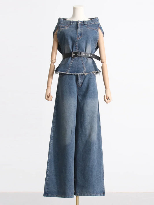 New Arrival Clothing Casual Sleeveless Denim Shirt Top With Belt Wide Leg Flare Jeans Pants Matching Sets Two 2 Piece Set Women
