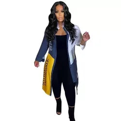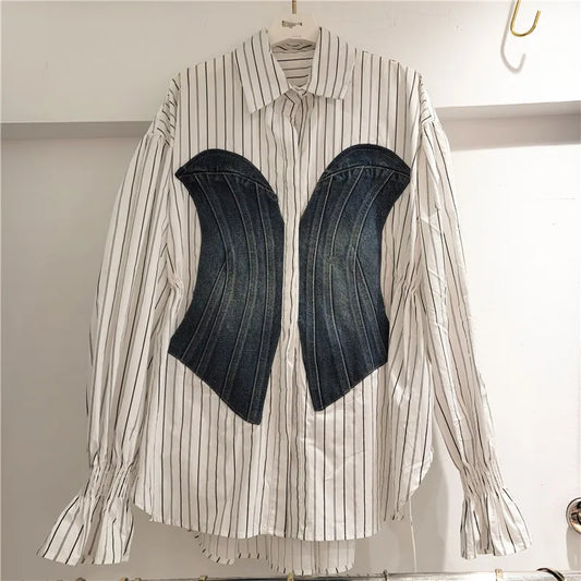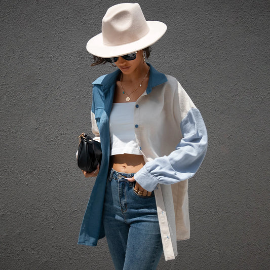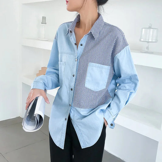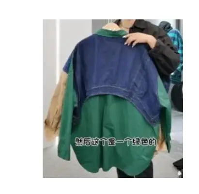 factory Women Blouse Denim Patchwork Stitched Ladies Shirt Long Sleeve Loose Leisure Irregular Shirts Female Tops