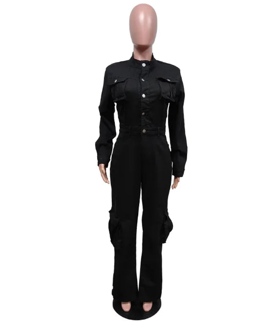 New Denim One Piece Jumpsuits Fall Clothes 2023 Long Sleeve Deep V-Neck Bodycon Women Casual Stretch Jean Denim Cargo Jumpsuits