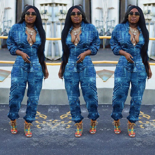 Fashionable Women's v-neck Long Sleeve Leisure imitations jeans Denim Printing Turn-down Collar Casual 3xl plus size Jumpsuits