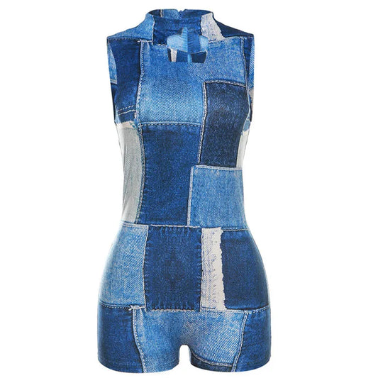 Denim Print Romper Women Sporty Sleeveless Vintage Summer Trend Streetwear Hipster Casual Jumpsuit