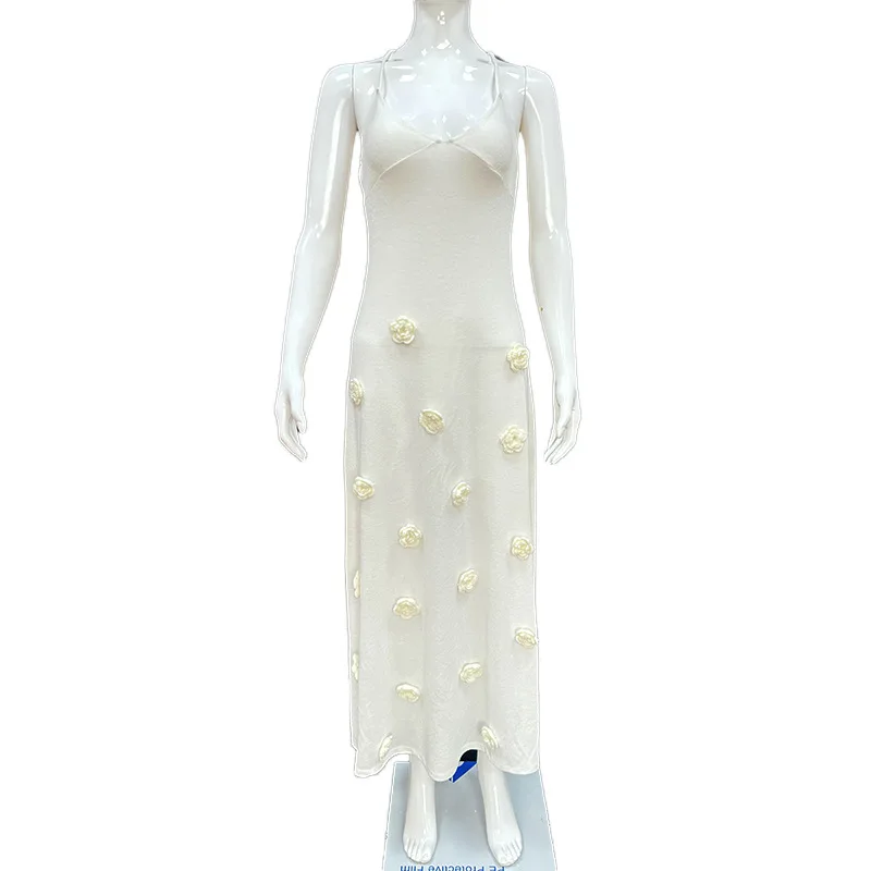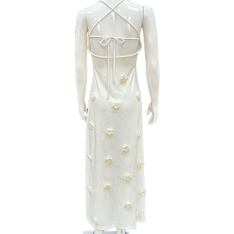 Elegant 3d Flower Knitted Dresses for Women V-neck Backless Sleeveless Lace up Female Maxi Dress 2024 Summer Lady Beach Robe New